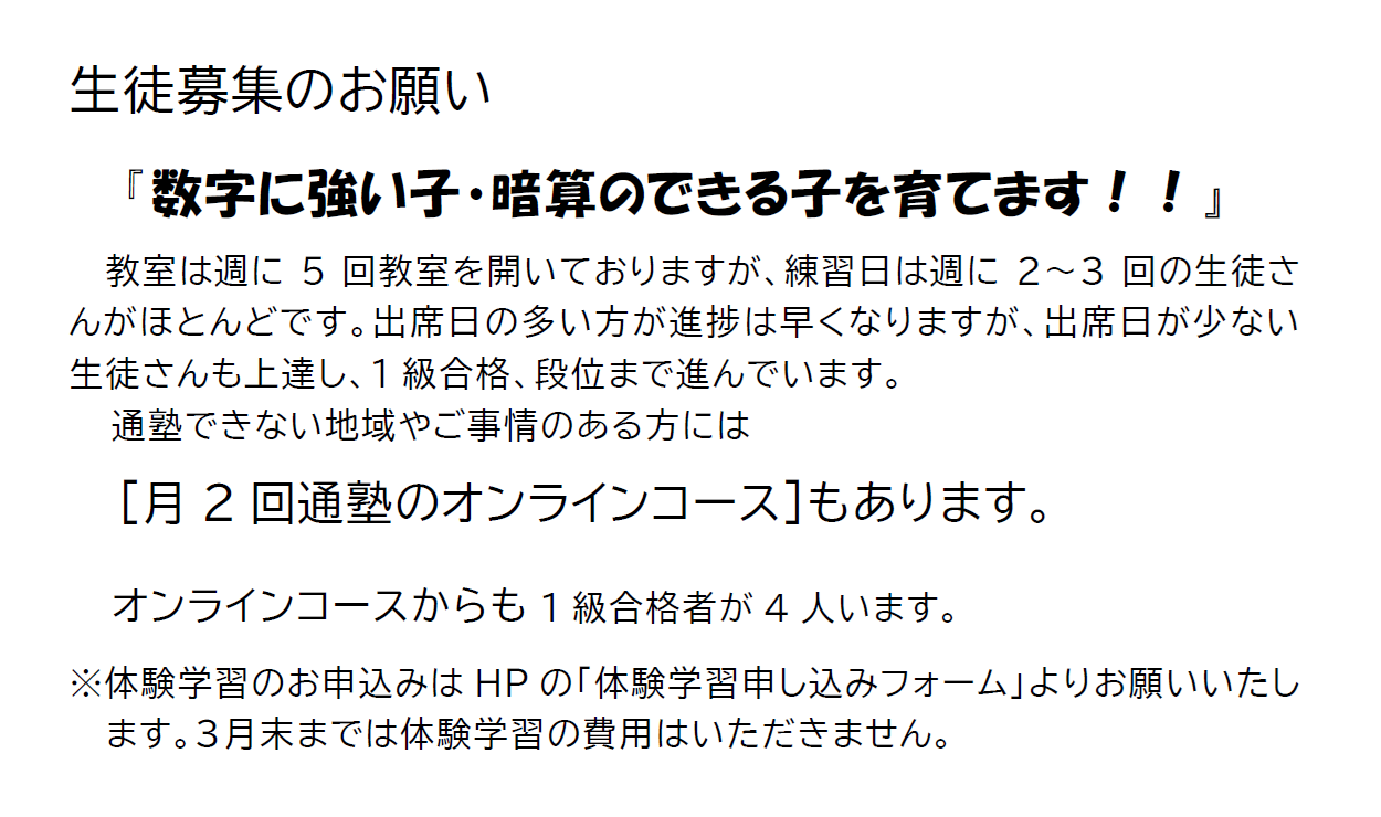 そろばん体験学習を受け付けていますので、お気軽にお越しください!体験学習についてはこちら